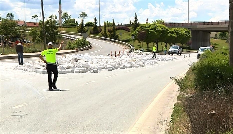 Eskişehir’de kontrolden çıkan tırın dorsesindeki tuğlalar çevreyoluna saçıldı.