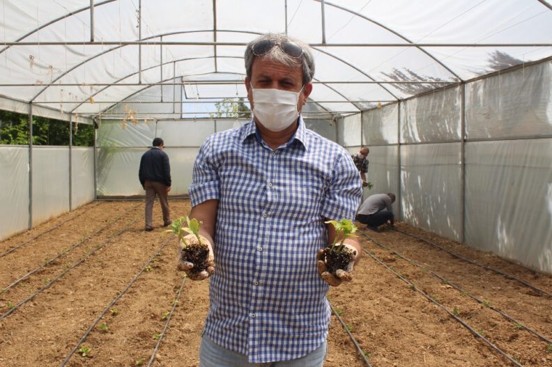 Elazığ’da bir lise bahçesinde kurulan seraya bu yıl öğrenciler Korona virüs salgını nedeniyle okula gidemeyince, gönüllü öğretmenler sebze fideleri dikti.