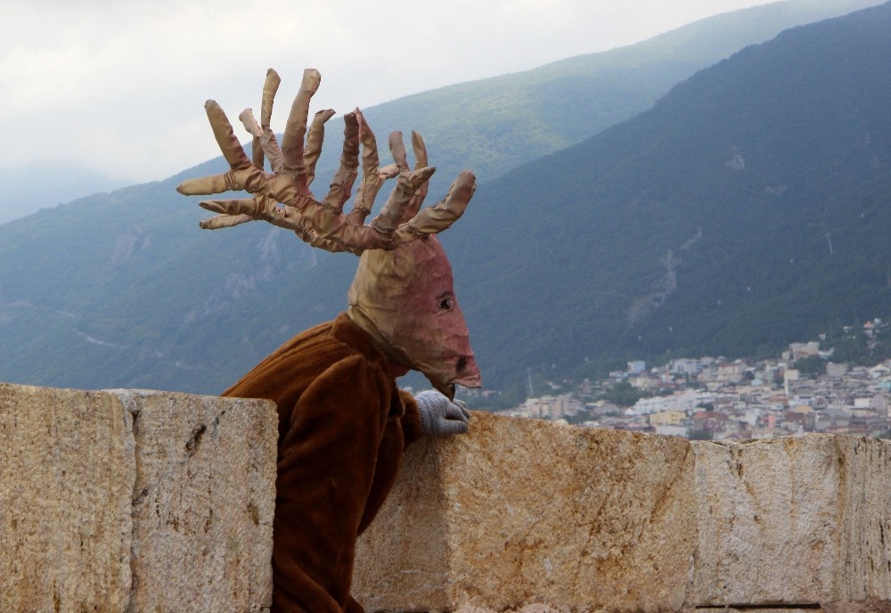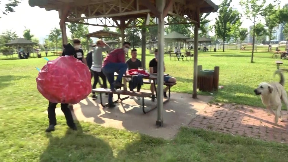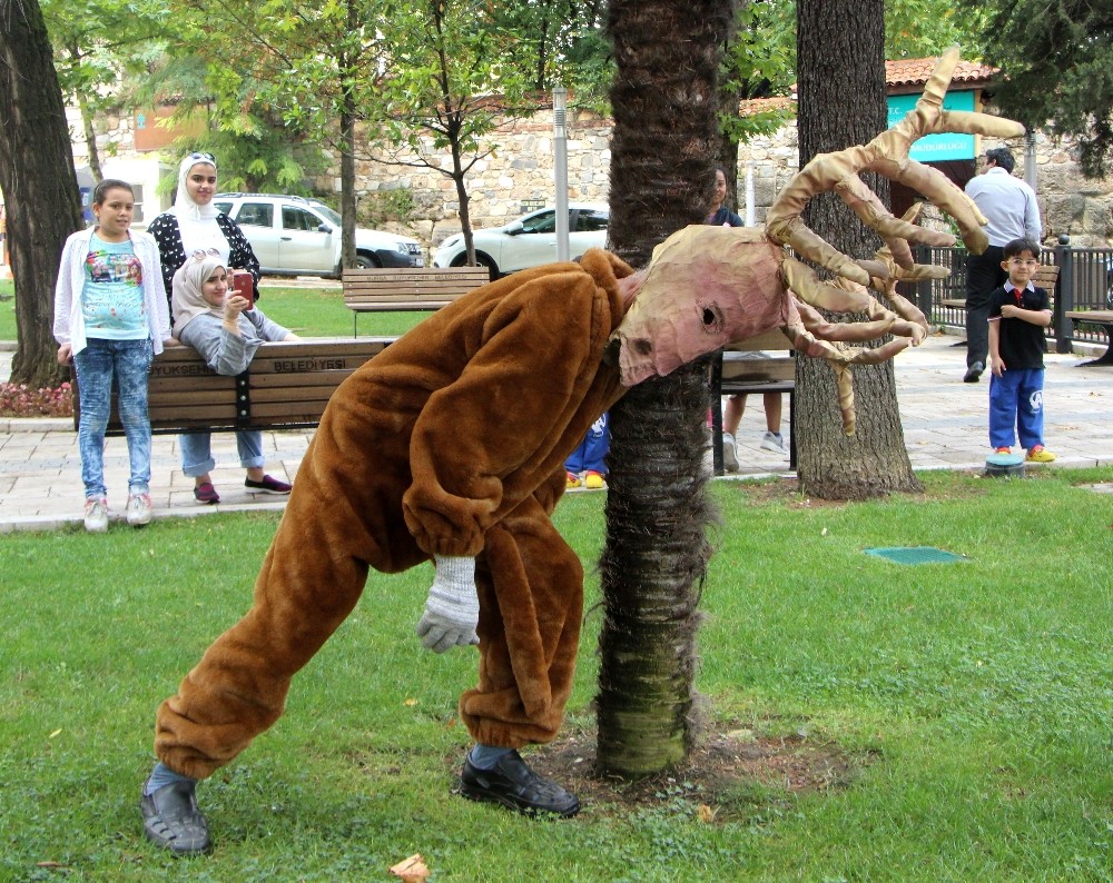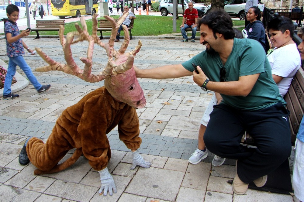 Kırmızı renkli küre şeklindeki kostümü gören bir köpek ise, tiyatrocuyu kovalamaya başladı. Köpeğin kendisini ısıracağından korkan tiyatrocu, hızla koşarak bölgeden uzaklaştı. Bu anlara şahit olan vatandaşlar kahkahaya boğuldu.