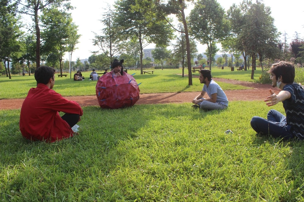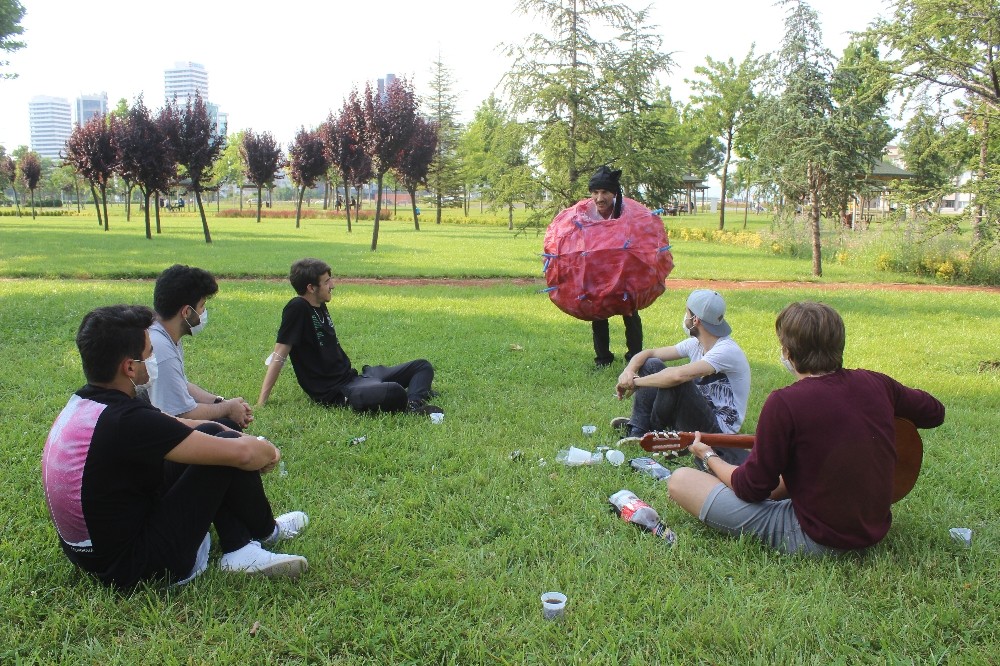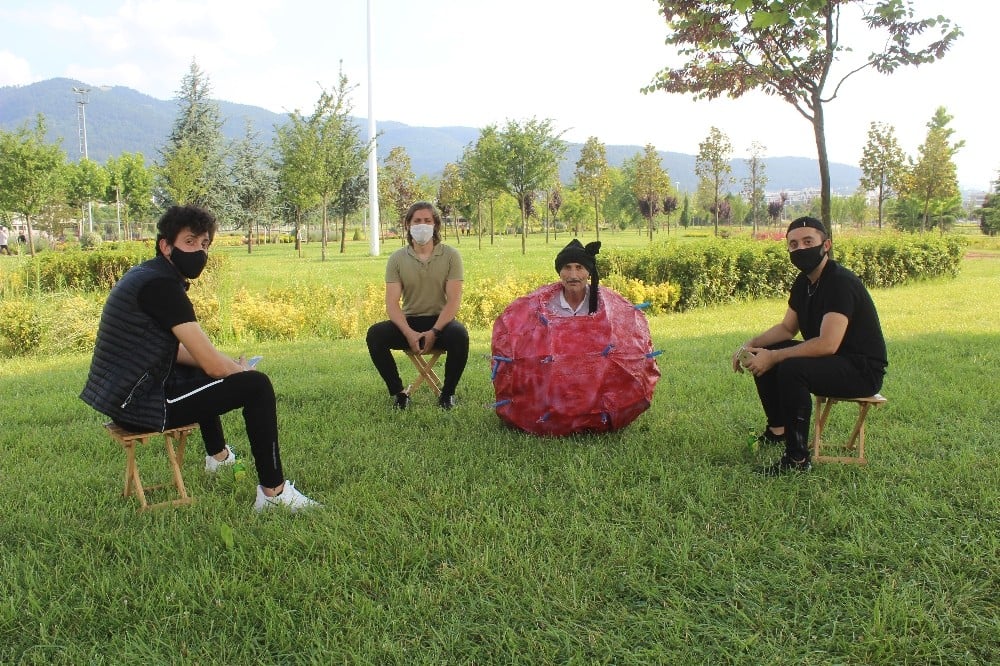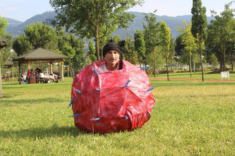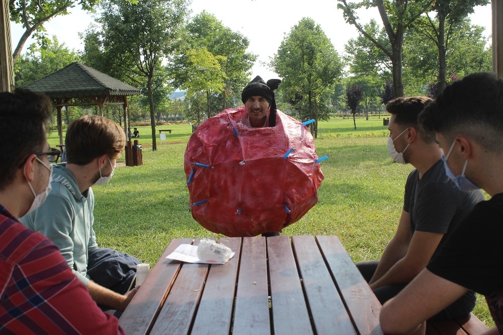Tiyatrocu Bahtiyar Keskin, daha önce bir çok kılığa girip farklı konularda vatandaşları bilinçlendirmişti. Bu defa kendi hazırladığı koronavirüs kostümünü giyip Bursa’nın muhtelif yerlerinde gezen tiyatrocu, maske takmayan ve sosyal mesafe kurallarına uymayan vatandaşları uyarıp maske taktırdı. Sosyal mesafe kurallarına uymayanları ise sosyal mesafeye getirdi.
