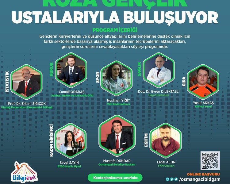 Program kapsamında, Osmangazi Belediye Başkanı Mustafa Dündar ile birlikte Cumali Odabaşı, Neslihan Yiğit, Doç. Dr. Evren Dilektaşlı, Yusuf Akkaş, Sevgi Sayın ve Erdal Altın gibi önemli isimler, meslek hayatlarında başarıya giden yolları gençlerle paylaşacak. Programa katılmak isteyen gençler, ‘osmangazibldgsm’ adresinden online başvuru yapabilecekler.