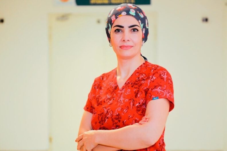 Salgınla mücadelede en ön safta görev alan hemşire Şerife Kürkçü, yoğun bakımda hastaları kurtarmak için çalıştıklarını belirterek “Salgının başlaması ile Covid-19 yoğun bakımında görev almaya başladım. Çalıştığım yoğun bakım servisine sadece pozitif hastalara geliyor. Hastalarımız bizi bu koruyucu kıyafetler ile görünce korkuya kapılıyorlar ve yaşadıkları süreç ile ilgili büyük bir endişe içinde oluyorlar. Koruyucu kıyafetlerimizin başta onların sağlıkları için olduğunu hastalarımıza anlatıyoruz. Yoğun bakım servisimizde kahvaltısından, tedavisine kadar tüm profesyonel hemşirelik hizmetlerini yerine getirmeye çalışıyoruz. İki kızımla salgının başlamasından bu yana hiç yüz yüze görüşemedim. Ailem büyük bir korku yaşıyor. Ama ben mesleğimin gerektiği profesyonel hizmeti yerine getirmek için buradayım. Hastalarımızın sağlığına kavuştuğunu görmek en büyük mutluluk kaynağımız” diye konuştu.