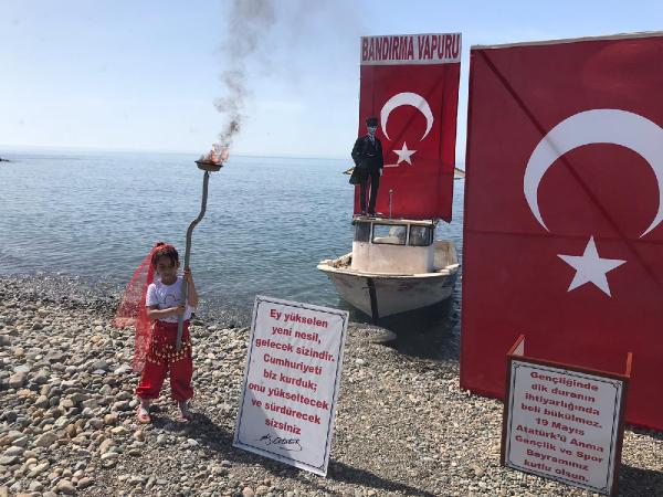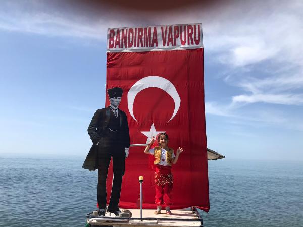 Doğancan İLEK/ ARDEŞEN, (Rize), (DHA)- RİZE’nin Ardeşen ilçesinde 2’nci sınıf öğrencisi Tuğçe Yakıcı (8), babası Sait Yakıcı ile birlikte 19 Mayıs Atatürk’ü Anma ve Gençlik Bayramı’nı kutladı. Baba ve kızı, Bandırma Vapuru’nu simgeleyen tekne ile kıyıya çıktı.