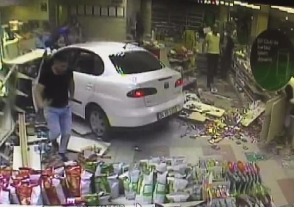 Lastiği patlayarak markete giren otomobilin kaza anı ise akaryakıt istasyonunun güvenlik kameraları tarafından kaydedildi. Görüntülerde marketi dalan otomobilin etrafı yıktığı ve bazı müşterilerin etrafa kaçıştığı görülüyor. Ardından otomobilden çıkan sürücüye istasyon görevlilerinin yardıma koştuğu gözleniyor.
