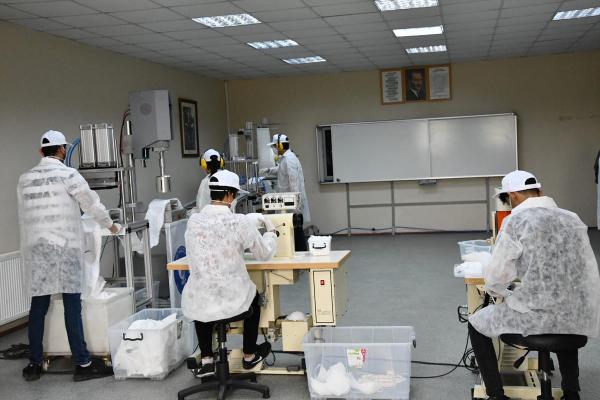 Kıroğlu, Ar- Ge ekiplerinin 5 kişiden oluştuğunu belirterek, “Burada toplam öğrencilerimizle birlikte 20 kişilik bir ekibimiz var. Koronavirüs başladığından beri tüm öğrenci ve öğretim kadromuzla birlikte maske üretimine devam ediyoruz. Önce ilçemiz, ilimiz, sonra bakanlık adına diğer illerimiz ve ilçelerimize veriyoruz. Ürettiğimiz maskeleri cerrahi olanları sağlık sektörüne ve kamu kurum ve kuruluşlara veriyoruz. N95 maskeleri ise öncelik onlara diye biriktirmeye başladık alım ve dağıtımları onlara göre yapacağız. Dışarıdan da sipariş gelmeye başladı özellikle farklı illerden. Onlar içinde görüşmelerimiz devam ediyor. Önce kendi ilimiz ve ilçelerimiz sonra diğer illerimize. Cerrahi maske kapasitemiz ise 2 bin adet paketlenmiş olarak sevkiyata hazır oluyor. Maskede 10 öğrenci tesisi çalıştırıyoruz. Okulumuz döner sermaye işletmesi kapsamında olduğu için örencilerimiz de yapmış oldukları iş kapsamında mevcut işin durumuna göre ücretlendirme yaparak kendileri de harçlıklarını kazanmış oluyorlar. Onlar için özel izin alınıyor. Veli ve kaymakamlık olurları ile tesislerimizde görev yapabiliyorlar” diye konuştu.