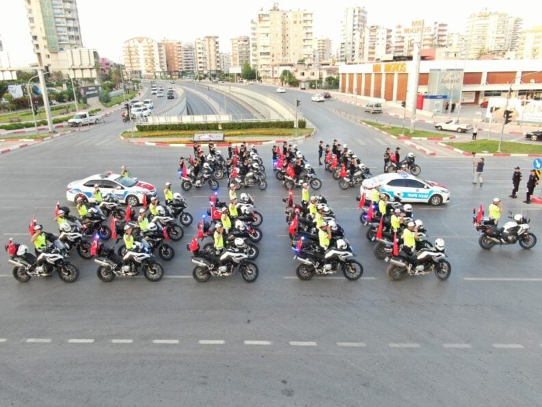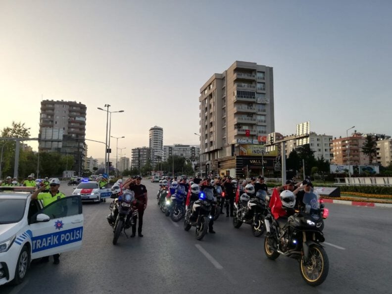 Korona virüs salgını dolayısıyla tüm Türkiye’de olduğu gibi Mersin’de de 19 Mayıs Atatürk’ü Anma, Gençlik ve Spor Bayramı kutlamaları sade törenlerle yapılırken, çeşitli kurumlar farklı etkinliklere imza attı. Mersin İl Emniyet Müdürlüğü ekipleri de ilk önce kortej oluşturup, halkın bayramını kutladı. Ekipler, Türk bayraklarıyla donatılan polis araçlarından oluşan kortejle Cumhuriyet Alanı’ndan çıkarak kentin farklı noktalarında tur attı. Siren sesleri eşliğinde tur atan polislere vatandaşlar da balkonlarından bayrak sallayıp, alkışlayarak destek verdi. Saat 19.19’da Üniversite Caddesi’nde duran ekipler, burada İstiklal Marşı’nı okudu. Polislere çevredeki vatandaşlar da destek verirken, etkinlik büyük beğeni topladı.