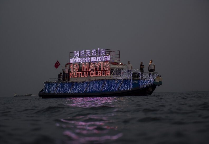’19 Mayıs kutlu olsun’ yazılı ışıklı bir tekne, Adnan Menderes Bulvarı’ndaki Beşiktaş Meydanı’ndan yol alarak kutlamaları denize taşıdı. Teknenin çıkışı sırasında gökyüzünü havai fişekler aydınlattı. Teknede İzmir ve 10. Yıl Marşları ile birlikte çeşitli şarkılar çalındı. Beşiktaş ve Fenerbahçe meydanlarının yanı sıra Viranşehir’de süren havai fişek gösterileri, Mersinlilere unutulmaz bir 19 Mayıs yaşattı.