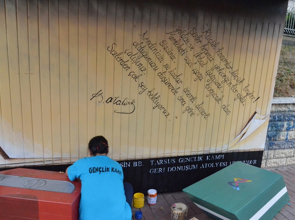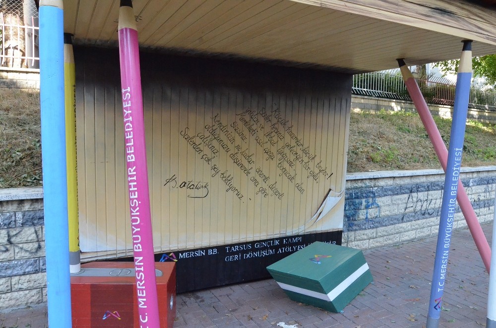 Kitap durağının iç kısmında ise Ulu Önder Mustafa Kemal Atatürk’ün çocuklara yönelik, “Küçük hanımlar, küçük beyler. Sizler hepiniz geleceğin bir gülü, yıldızı ve ikbal ışığısınız. Memleketi asıl ışığa boğacak olan sizsiniz. Kendinizin ne kadar önemli, değerli olduğunuzu düşünerek ona göre çalışınız. Sizlerden çok şey bekliyoruz” sözleri de yer alıyor. Tarsus Gençlik Kampı içerisinde bulunan geri dönüşüm atölyesinde üretilen kitap durağı için herhangi bir masraf yapılmadı. Geri dönüşümde kullanılabilecek malzemelerin temin edilmesinin ardından atölyedeki ustaların hayat verdiği durakların üretimine devam edilecek.