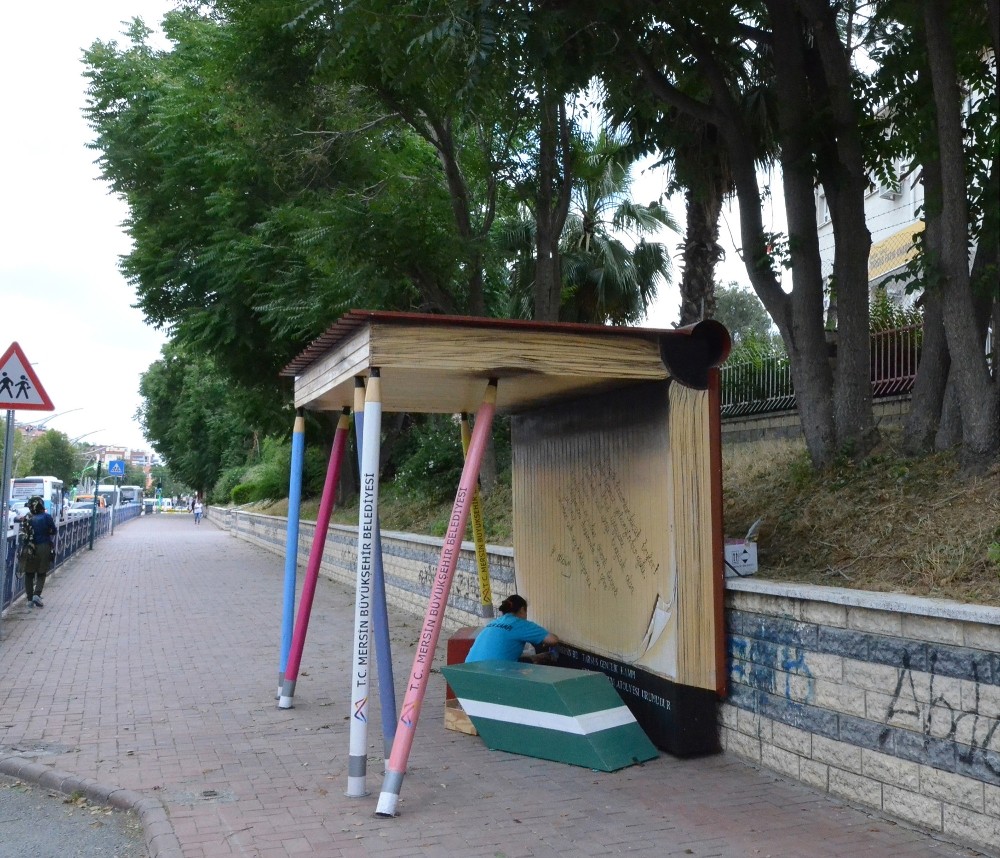 Mersin’de belediyenin geri dönüşüm atölyesinde, toplu taşıma araçlarının yolcu indirip bindirdikleri noktalara yerleştirilmek üzere ’kitap durağı’ üretildi.