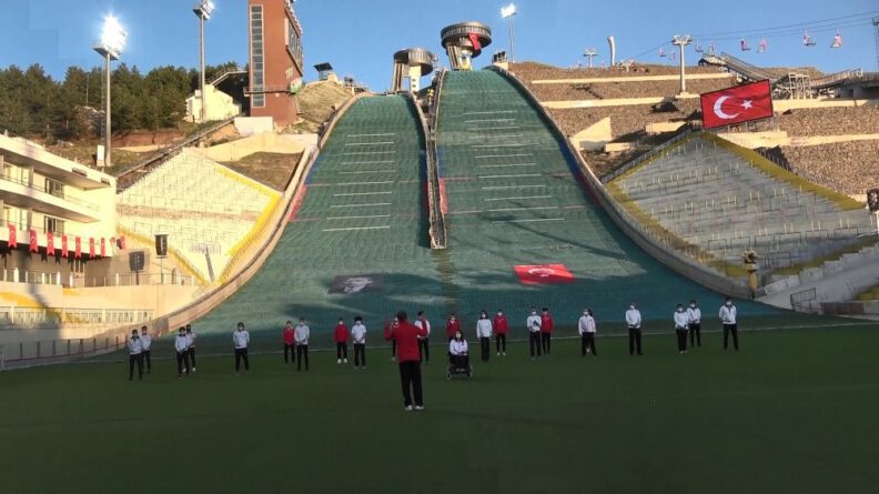 Erzurum’da milli sporcular, 19 Mayıs Atatürk’ü Anma, Gençlik ve Spor Bayramı dolayısıyla Kayakla Atlama Kulesi’nde İstiklal Marşı okudu.