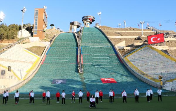 Turgay İPEK/ERZURUM, (DHA)- ERZURUM’da 20 milli sporcu, 19 Mayıs Atatürk’ü Anma, Gençlik ve Spor Bayramı nedeniyle Türkiye’nin ilk ve tek olan Kayakla Atlama Kulesi’nde saat 19.19’da İstiklal Marşı okudu.