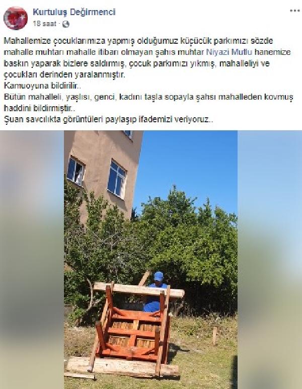 Olayın ardından muhtardan şikayetçi olan Kurtuluş Değirmenci, cep telefonuyla kaydettiği o anları sosyal medya hesabından paylaşarak, “Mahallemizde çocuklara yapmış olduğumuz küçücük parkımızı sözde mahalle muhtarı Niyazi M., hanemize baskın yaparak bizlere saldırmış, çocuk parkını yıkmış, mahalleyi de çocukları da derinden yaralamıştır. Kamuoyuna bildirilir. Bütün mahalleli, yaşlısı, genci, kadını taşla sopayla şahsı mahalleden kovmuş haddini bildirmiştir. Şu an savcılıkta görüntüleri paylaşıp ifademizi veriyoruz” dedi.