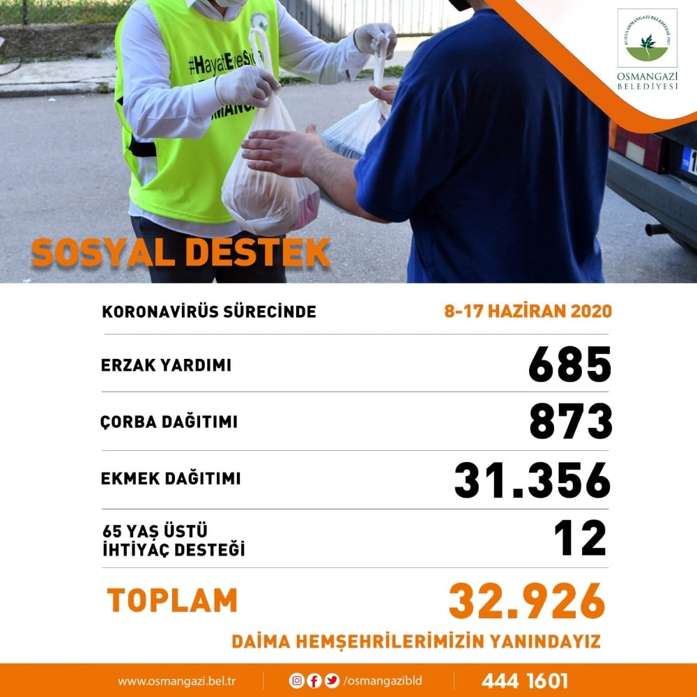 İlçenin dört bir yanındaki talepleri karşılayan Osmangazi Belediyesi Vefa Sosyal Destek Grubu, son 10 günde 32 bin 926 sosyal destek çalışması gerçekleştirdi. Resmî kurumlarla koordineli bir şekilde çalışan ekipler, 8-17 Haziran tarihleri arasında 31 bin 356 ekmek, 873 çorba ve 685 erzak dağıtımı yaptı. Aynı zamanda 65 yaş üstü 12 vatandaşa alışveriş desteğinde bulunan Osmangazi Belediyesi ekipleri, hiç kimsenin mağduriyet yaşamaması için gayret gösteriyor.