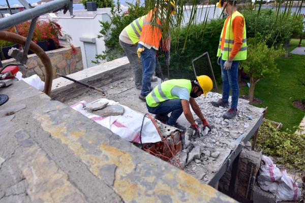 Cavit AKGÜN/ BODRUM (Muğla), (DHA)- MUĞLA’nın Bodrum ilçesinde yazar Yılmaz Özdil’in eşi Hülya Özdil’in satın aldığı, imara aykırı yapılaşmayla 142 metrekareden 310 metrekareye çıkarılan villanın kaçak eklentilerinin dün başlanan yıkım işlemine bugün de devam edildi. İşçilerin yıkım sırasında kaçak eklentileri hilti ile kırdığı görüldü.