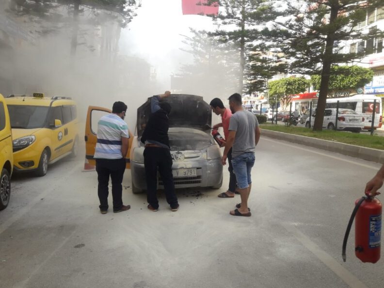 Antalya’da park halindeki taksi alev aldı. Çevredeki vatandaşların yangın tüpleriyle müdahale ettiği araç söndürüldü.