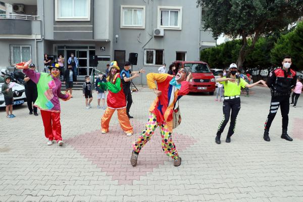 Can ÇELİK/ADANA, (DHA)- ADANA’da polis ekipleri, Ramazan Bayramı’nda kısıtlama nedeniyle evde kalan ailelerin ve çocuklarının eğlenceli vakit geçirmesi adına apartmanların altında palyaço ve müzik eşliğinde eğlence düzenledi.