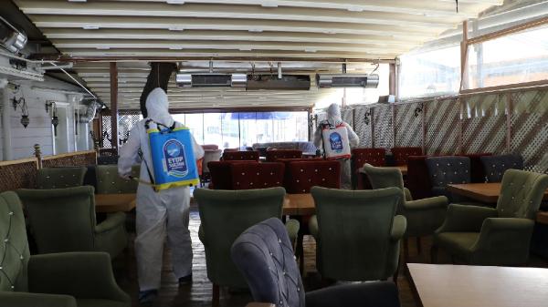 Ekipler, haftasonu iki günlük sokağa çıkma kısıtlamasında da çalışmalarını sürdürerek, Eyüpsultan’da 1 Haziran Pazartesi gününden itibaren vatandaşlara yeniden hizmet verecek olan restoran, kafe, pastane, kıraathane ve dernek lokalleri gibi işletmelerde dezenfeksiyon çalışması yaptı.