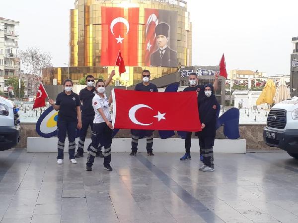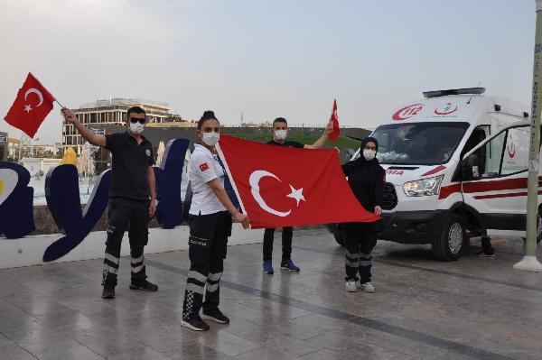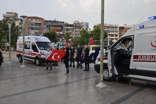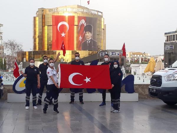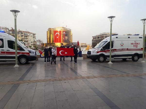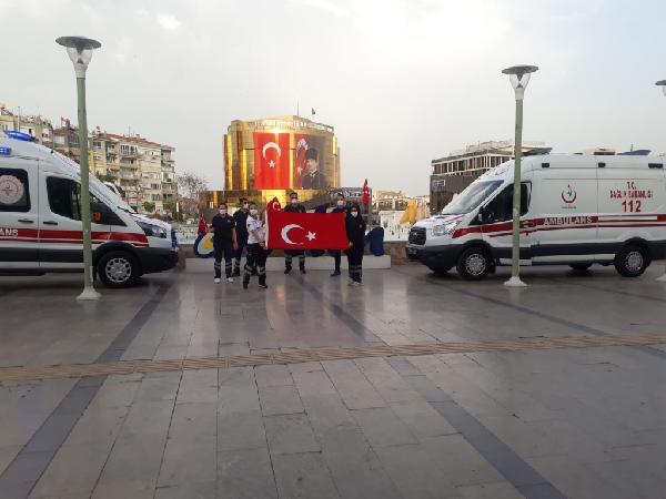 Cemal YILDIRIM/AYDIN, (DHA)- KORONAVİRÜS’ün en büyük savaşçıları sağlık çalışanları, Aydın’da, 19 Mayıs Atatürk’ü Anma, Gençlik ve Spor Bayramı’nı coşkusunu saatler 19.19’u gösterdiğinde ambulansın hoparlörlerinden İstiklal Marşı çalarak kutladı.
