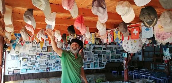 “Gelirken bize hediyeler getiriyorlardı, bu tişört olurdu, şapka olurdu. Güzel deniz ürünleri yapıyorduk, müşteriler de şapka hediye etmeye başladı. Biz de bu şapkaları ne yapalım, tavana asalım dedik. Güzel bir dekorasyon oldu. Günden güne büyüdü, şu an 800 ile 1000 arası tavanda asılı. Her gelen bir seremoni yapıyordu. Bizim için de gurur kaynağı oldu. Hedefimiz, olmazsa olmazımız gelen müşterilerin güler yüzle gitmeleri.”