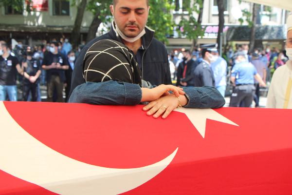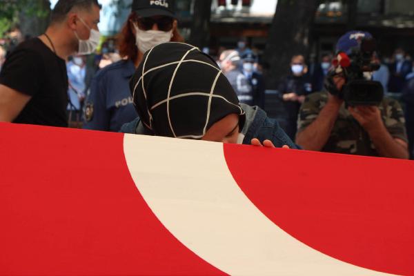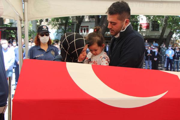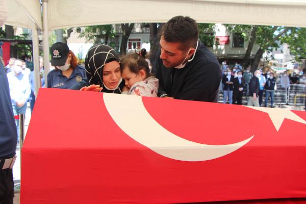Şehit Arslan’ın eşi Gözde Arslan, eşinin Türk bayrağına sarılı tabutuna sarılıp gözyaşı döktü. Cenazeye katılan Bakan Soylu, “Helalleşemedik, kızım için sabrediyorum” diyen acılı eşe taziye dileklerinde bulundu.