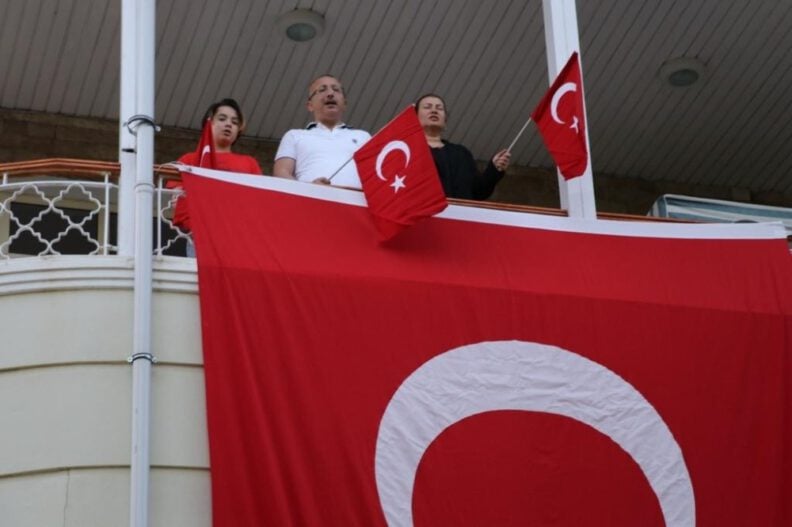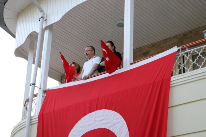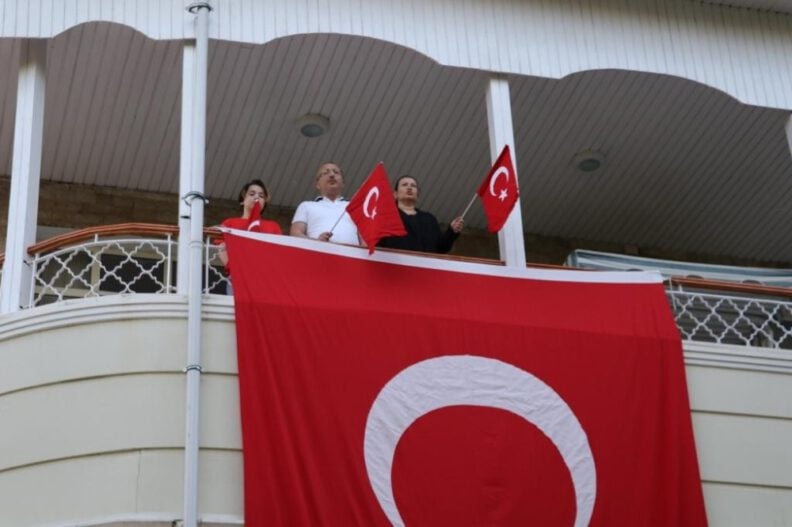 Siirt Valisi Ali Fuat Atik, eşi Fulya Atik ve çocuğuyla konutunun balkonunda Türk bayrakları sallayarak İstiklal Marşı’nı okudu. Kent merkezinde evlerin balkonları Türk bayrağıyla dalgalandı.