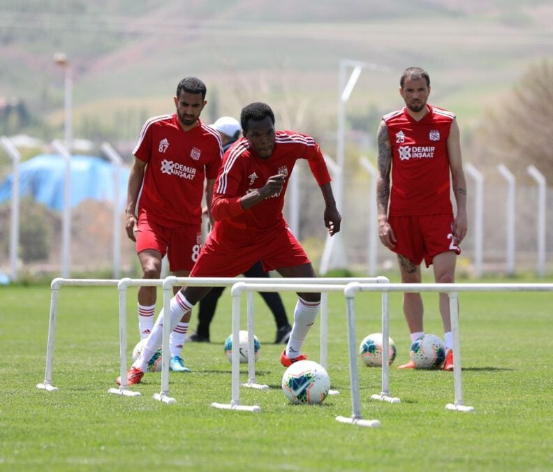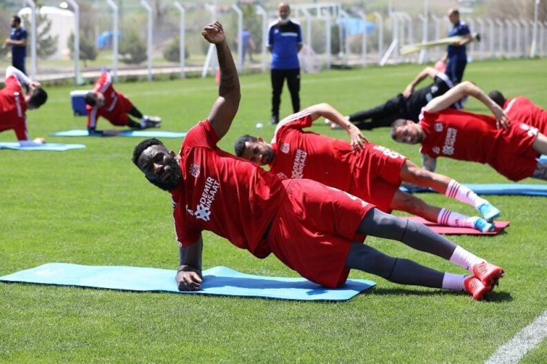 Kkorona virüs salgını nedeniyle liglere verilen arada Sivassporlu futbolcular, belirlenen kurallar dahilinde kulüp tesislerinde gruplar halinde çalışmalarını sürdürüyor.