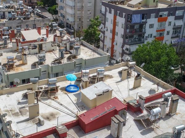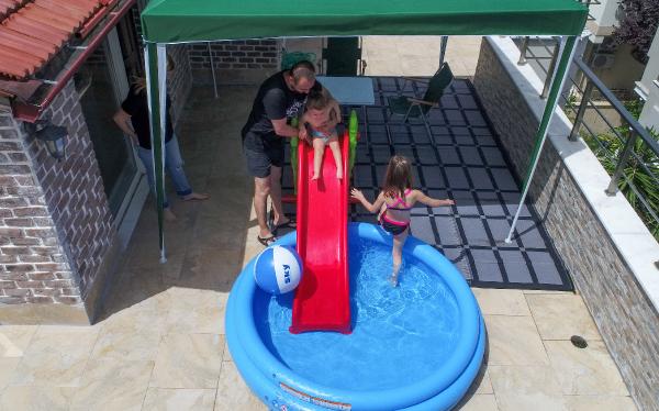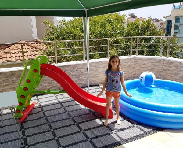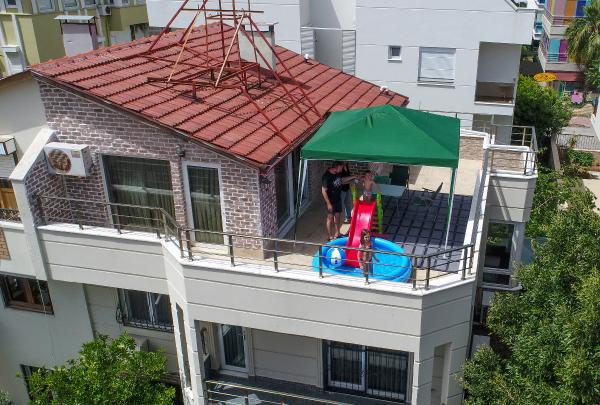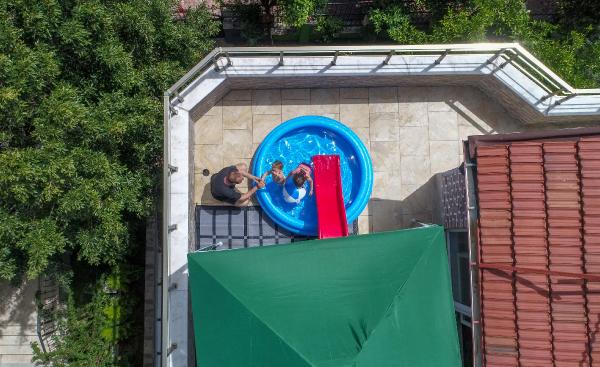 Antalya’yı etkisi altına alan sıcak hava, koronavirüs salgını nedeniyle evlerinde kalanlara, alternatif serinleme çözümleri ürettirdi. Koronavirüs tedbiri için girişi kapalı olan sahillere gidemeyenler, sıcaktan bunalan çocuklarını şişme havuzda serinletti. Yıldız Mahallesi’nde oturan aile, 5 katlı apartmandaki dairesinin terasında plastik havuz şişirdi. İçini su dolduran aile fertleri, çocuklarına oyun alanı oluşturdu.