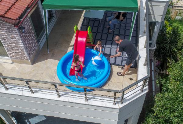 İbrahim LALELİ/ANTALYA, (DHA)- KORONAVİRÜS önlemleri kapsamında evlerinde kalan Antalyalılar, havanın ısınmasıyla çocuklarının serinlemesi için teras ve balkonlarına su dolu şişme havuz koydu.