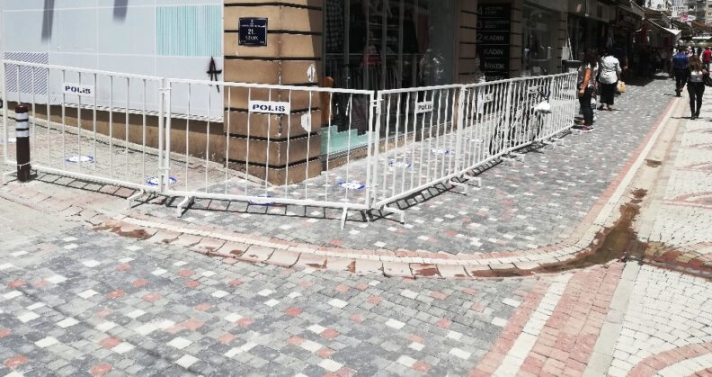 Aydın’da polis ekipleri sosyal mesafeye uyulması konusunda anonsla vatandaşları uyarırken, banka ve PTT gibi kuruluşların önlerinde barikatlı önlem alıyor. Önceki gün Efeler Yağcılariçi Çarşısı’nda bulunan bir giyim mağazası önünde oluşan sosyal mesafesiz kuyrukta vatandaşların çocukları ile birlikte iç içe vaziyette bulunması tepkiye yol açmıştı. Konunun gündeme getirilmesinin ardından Aydın İl Emniyet Müdürlüğü ekipleri mağaza önünde sosyal mesafeyi korumak için barikat kurarken, firma yetkilileri de vatandaşların sosyal mesafeye dikkat etmeleri için uyarı notları yerleştirdi.