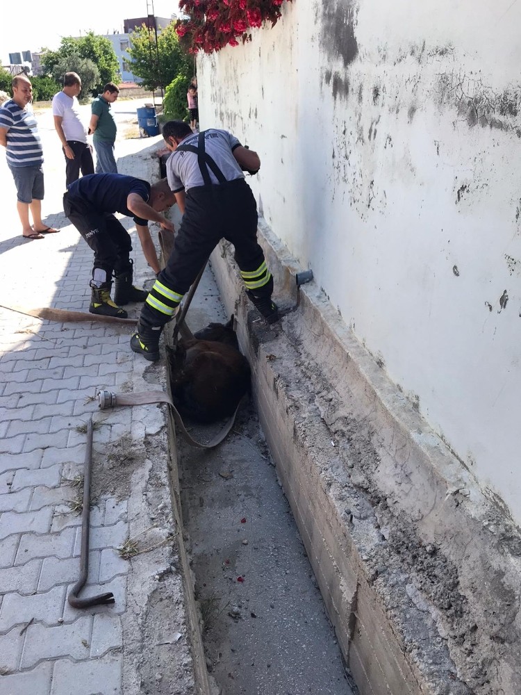 Hatay’ın Samandağ ilçesinde su kanalına düşen eşek, itfaiye ekiplerince kurtarıldı.