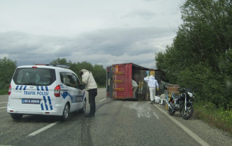 Devrilen kamyonetteki binlerce arı karayolunu bastıAntalya istikametinden Elazığ Karakoçan ilçesine 620 arı kovanı götüren Zülküf Birkan idaresindeki 21 DF 525 kamyonet, Gölbaşı ilçesine bağlı Çatalağaç Köyü çıkışında sürücünün direksiyon hakimiyetini kaybetmesi sonucu kontrolden çıkarak şarampole devrildi. Meydana gelen kazada kamyonet sürücüsü Zülküf Birkan ve araçta bulunan Yunus Emre Soylu ile Muhammed Yılmaz yaralandı. Yaralıları almak için olay yerine gelen sağlık ekipleri kamyonet kasasından dışarıya savrulan arı kovanları içerisinden çıkan arılardan dolayı yaklaşamadı. Sağlık ekipleri daha sonra olay yerine getirilen korucu tulumları giyerek yaralılara müdahale etti. Yaralılar daha sonra Gölbaşı Devlet Hastanesine kaldırıldı. Daha sonra olay yerine gelen görevliler, giydikleri özel kıyafetler sonrasında dağılan arı kovanlarını topladı. Arı kovanlarının daha sonra Elazığ’a gönderileceği öğrenildi.