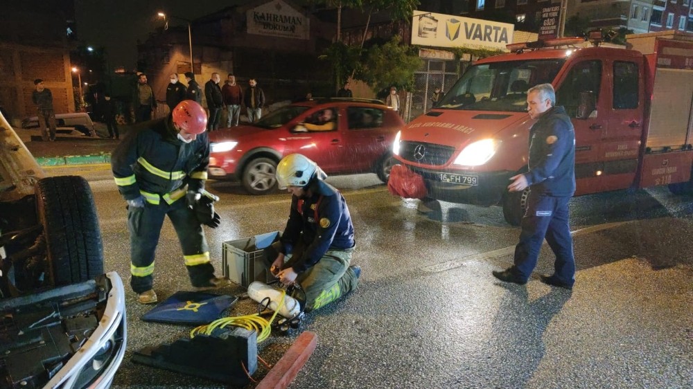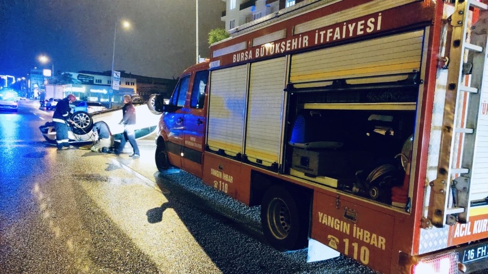 Bursa’da yağmurlu havada direksiyon hakimiyetini kaybederek takla atan otomobilde hasar meydana gelirken, sürücü burnu bile kanamadan araçtan itfaiye ekipleri tarafından çıkartıldı.