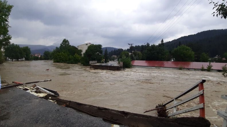 Kastamonu’da dün akşam saatlerinden itibaren etkili olan sağanak yağış sonrası birçok bölgede sel taşkınları yaşandı. Sel suları nedeniyle birçok ilçede hayat dururken, heyelanlar nedeniyle yollar kapandı, sel suları nedeniyle köprüler yıkıldı, araçlar ve iş yerleri sular altında kaldı. Ayrıca belediye ekiplerince şu ana kadar evlerinde mahsur kalan yaklaşık 50 kişi de kurtarıldı, ayrıca mahsur kalan vatandaşlara ulaşmak için ekipler çalışmalarını aralıksız sürdürüyor.
