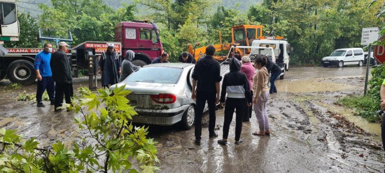 Bartın’da etkili olan sağanak yağış sonrası çöken yola düşen iki araçtaki 12 kişi araçların camlarından çıkarak kurtuldu.