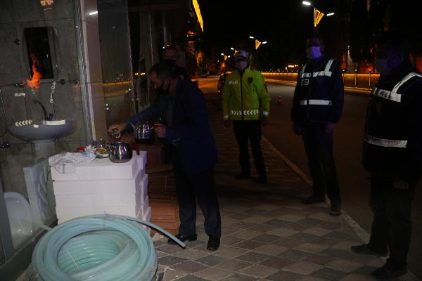 Fatih YILMAZ/TOKAT, (DHA)- TOKAT’ta, sokağa çıkma yasağı kapsamında denetim yapan polis ekiplerine bir mahalleli çay ikramında bulundu.