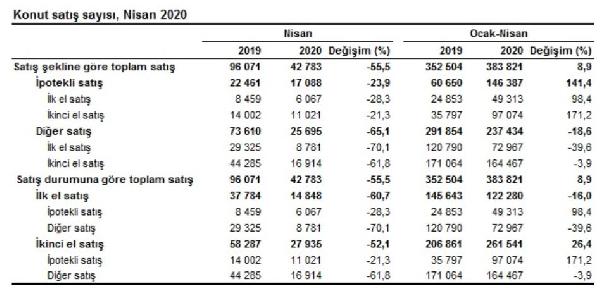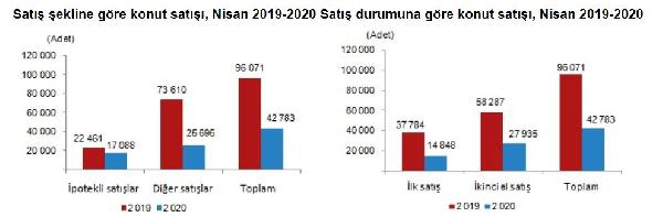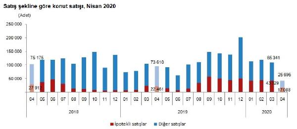 Türkiye genelinde 2020 Nisan ayında ipotekli konut satışları bir önceki yılın aynı ayına göre yüzde 23.9 azalarak 17 bin 88 düzeyine indi. Toplam konut satışları içinde ipotekli satışların payı yüzde 39.9 olarak gerçekleşti. İpotekli satışlarda İstanbul 2 bin 451 konut satışı ve yüzde 14.3 pay ile ilk sırayı aldı. İpotekli konut satışının en az olduğu il 2 konut ile Hakkari oldu.