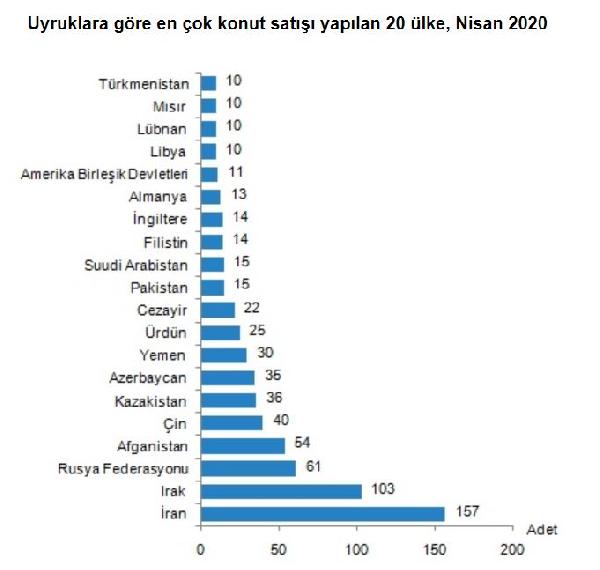 Nisan ayında İran vatandaşları Türkiye’den 157 konut satın aldı. İran’ı sırasıyla, 103 konut ile Irak, 61 konut ile Rusya Federasyonu, 54 konut ile Afganistan ve 40 konut ile Çin izledi. (Grafik – Tablo)