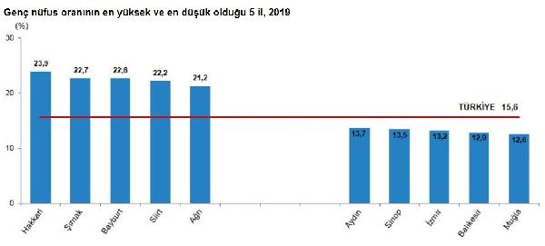 ADNKS sonuçlarına göre 2019 yılında genç nüfus oranının en yüksek olduğu il, yüzde 23.9 ile Hakkari oldu. Bu ili yüzde 22.7 ile Şırnak ve yüzde 22.6 ile Bayburt izledi. Genç nüfus oranının en düşük olduğu iller ise sırasıyla, yüzde 12.6 ile Muğla, yüzde 12.9 ile Balıkesir ve yüzde 13.2 ile İzmir oldu.