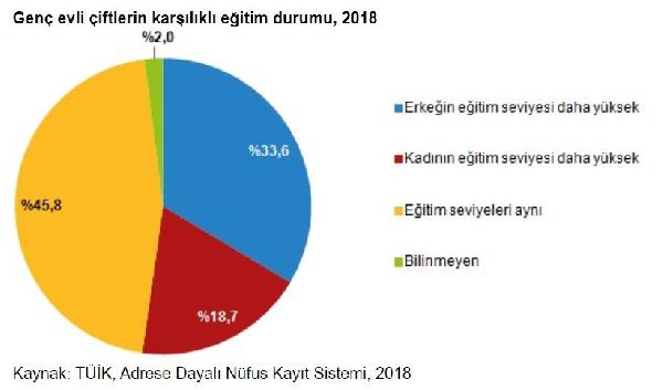 ADNKS sonuçlarına göre genç nüfusun resmi evliliklerinde eşleri arasındaki eğitim farkı incelendiğinde, 2018 yılında genç kadınların yüzde 33.6’sının kendilerinden daha yüksek eğitimli erkeklerle evli olduğu, yüzde 18.7’sinin ise eşlerinden daha yüksek eğitim seviyesine sahip olduğu görüldü. Eğitim seviyeleri aynı olan genç çiftlerin oranı yüzde 45.8 oldu.