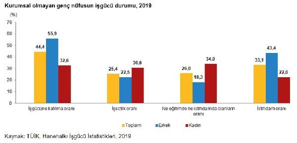Hanehalkı işgücü araştırması sonuçlarına göre genç nüfusun istihdam oranı 2018 yılında yüzde 35.0 iken 2019 yılında yüzde 33.1 oldu. Genç erkeklerde istihdam oranı 2018 yılında yüzde 46.4 iken 2019 yılında yüzde 43.4 olurken genç kadınlarda bu oran 2018 yılında 23.4 iken 2019 yılında yüzde 22.6 oldu.
