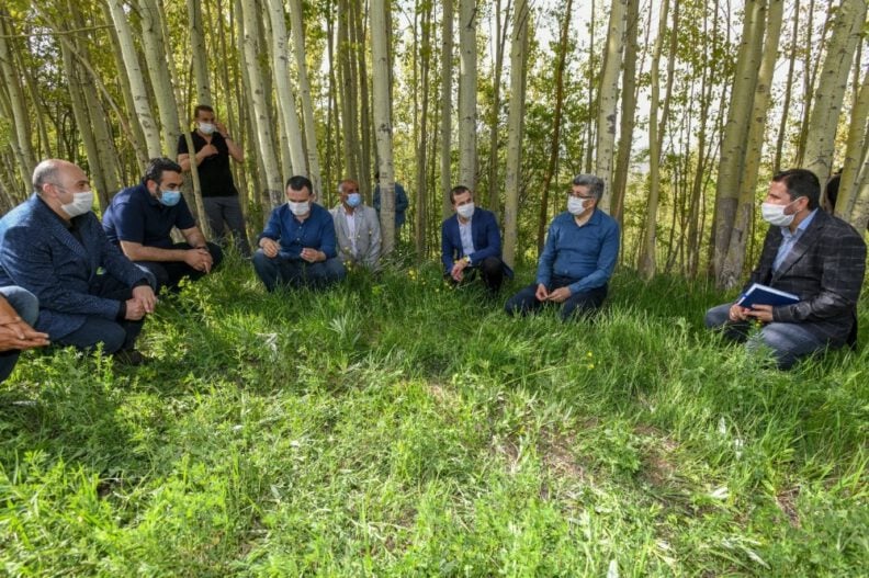 Çalışmaları yerinde incelemek üzere Edremit Kaymakamı ve Büyükşehir Belediyesi Genel Sekreteri Muhammet Fuat Türkman, Gevaş Kaymakamı Hamit Genç, Tarımsal Hizmetler Dairesi Başkanı Yusuf Altun ve Yol Yapım, Bakım ve Onarım Dairesi Başkanı Halil İbrahim Ateş ile birlikte mahalleye gelen Vali ve Büyükşehir Belediye Başkanı Mehmet Emin Bilmez, çalışmanın yürütüldüğü araziye yaklaşık 45 dakikalık yürüyüşün ardından ulaştı. Salgın süresince dışarı çıkmanın istisnai durumunun tarım olduğunu ifade eden Vali Mehmet Emin Bilmez, başından bu yana tarıma herhangi bir kısıtlama gelmediğini, hatta teşvik edildiğini ifade etti. Vali Bilmez, ‘‘Belediye olarak bu sene hizmet ağırlığını tarıma verdik. Şu anda farklı bölgelerde araçlarımız sulama kanalları açmakta, var olanları daha elverişli bir kullanıma sunmak için çalışmaktadır. Yeni araç ihalelerini de yaptık. Bayramdan sonra onlar da kullanıma girecek. Bu sene tüm arazilerin ekilmesi için vatandaşlarımıza yardımcı oluyoruz. Salgın sürecinin ardından tarımın çok daha önemli bir noktaya geleceğini, tarımsal ürünlere hem bizim hem de dünyanın ihtiyacı olacağını biliyoruz. Çok şükür bu sene yağışlar açısından verimli geçti. Biz tarım açısından verimli bir yıl olacağına inanıyoruz. Vatandaşlarımızın daha iyi bir verim alabilmesi için bizlerde onların yanındayız. Bazı mahallelerimizde daha düzgün suyun akışını bozmayan toprak kanallar yeterli olurken, bazı mahallelerde ise beton kanallarımız var. Bunun yanı sıra güneş enerjisi ile kuyu suyunun çıkartılması projemiz de var. Bu projede DAKA’nın ciddi desteği var. Muhtarlarımız da vatandaşlarımız da bizlere destek oluyor. Kendilerine de teşekkür ediyorum’’ dedi.