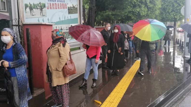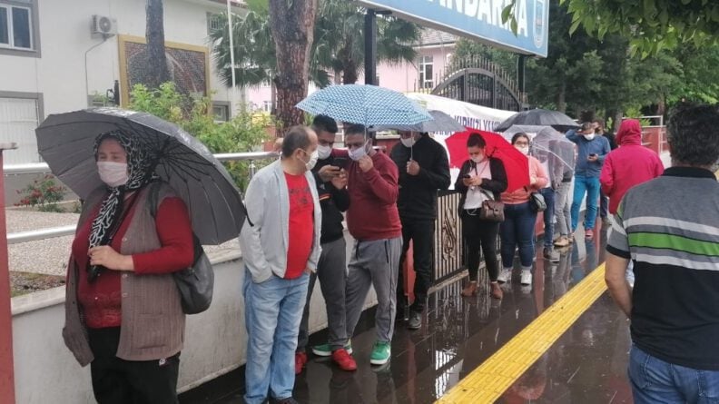 Kuyruktaki vatandaşların bazılarında şemsiye olmaması sosyal mesafe kuralının çiğnenmesine neden olurken, Manavgat Emniyet Müdürlüğüne bağlı ekipler, Antalya Caddesinde ve PTT önünde vatandaşları sosyal mesafeyi korumaları konusunda sürekli uyardı.