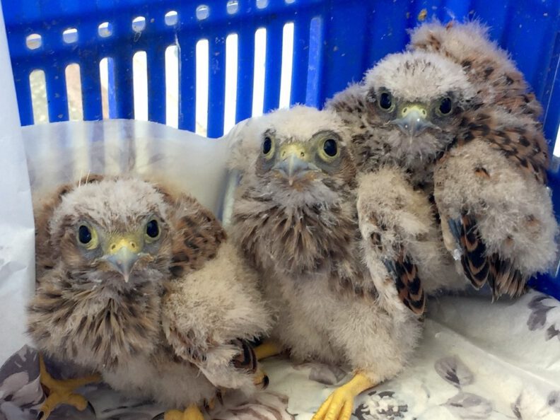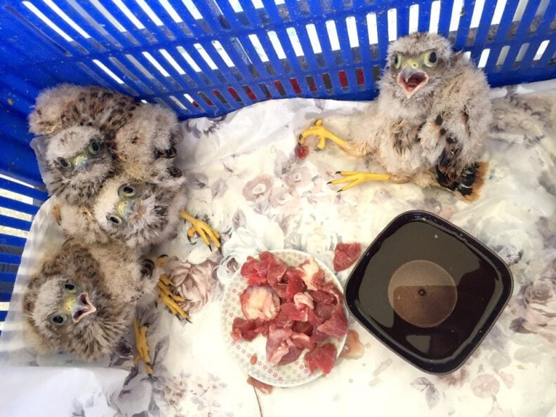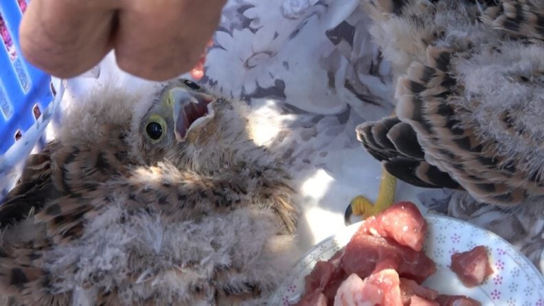 Adıyaman’da ağaçtaki yuvadan düşen 4 kartal yavrusu vatandaşlar tarafından etle besleniyor.